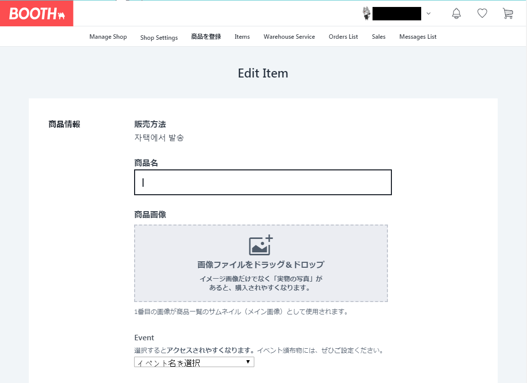 어떤 배송 방법을 선택하셔도 대체적으로 다 비슷한 화면이 뜹니다. 판매방법(販売方法, Item Type)은 자택에서 발송을 선택하셔서 들어오셨기에 자동으로 해당 방법으로 선택되어 있습니다.