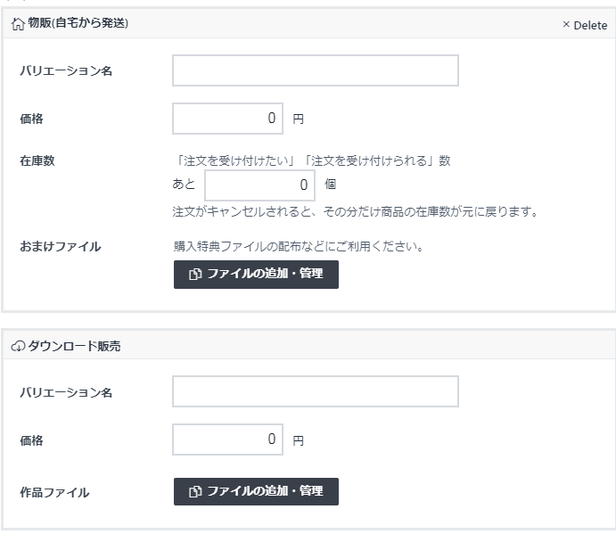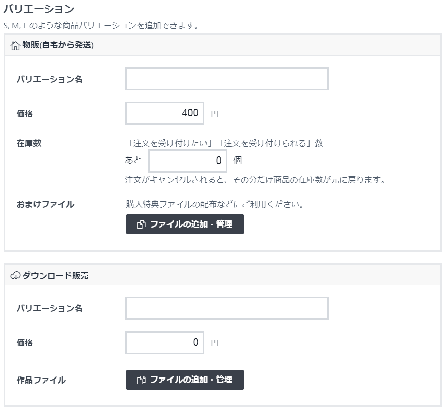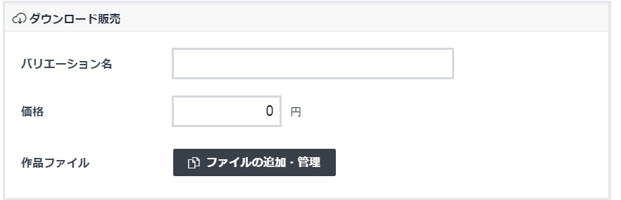 다운로드 판매 옵션의 공란은 바리에이션 이름(バリエーション名)과 가격(価値) 입니다.