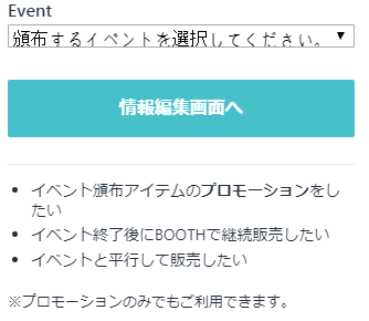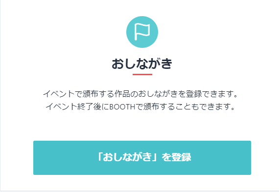 이벤트에서 배포하는 작품의 인포를 등록할 수 있습니다. 이벤트 종료 후 BOOTH에서 배포할 수도 있습니다.