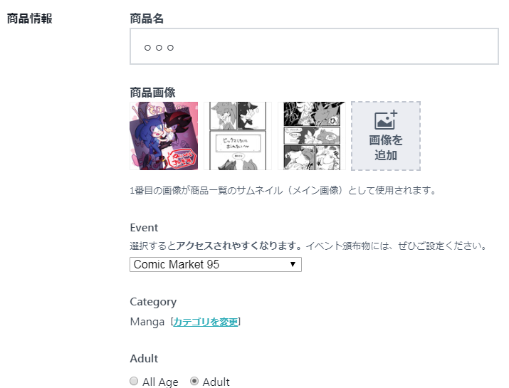 선택하시면 (상품에) 액세스 하기 편해지신다네요. 이벤트(행사)에 내셨던 물건이라면 여기서 골라주셔도 됩니다. 물론 여기에 없는 이벤트도 (소규모 온리전 같은) 있습니다.